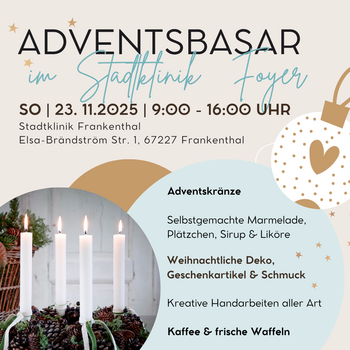 Am Sonntag, 23. November 2025, findet von 9:00 Uhr bis 16:00 Uhr wieder unser traditioneller Adventsbasar im Foyer der Klinik statt.