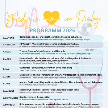 Mit der erfolgreichen Vortragsreihe "Medizin im Dialog" setzen wir auch im neuen Jahr fort. Von Januar bis Dezember 2026 informieren unsere Expertinnen und Experten einmal monatlich über medizinische Themen, die viele Menschen betreffen - verständlich erklärt, aktuell und praxisnah.